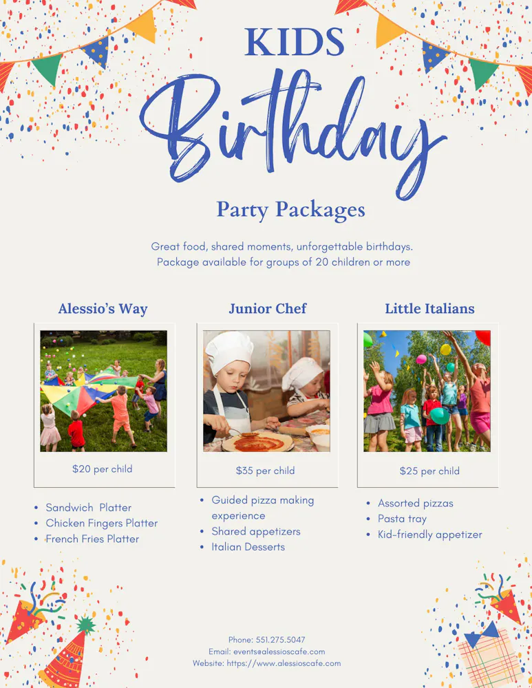 Visit https://www.alessioscafe.com/menu/catering-menu/ for pizza menu as well Chicken Fingers and other kids friendly options