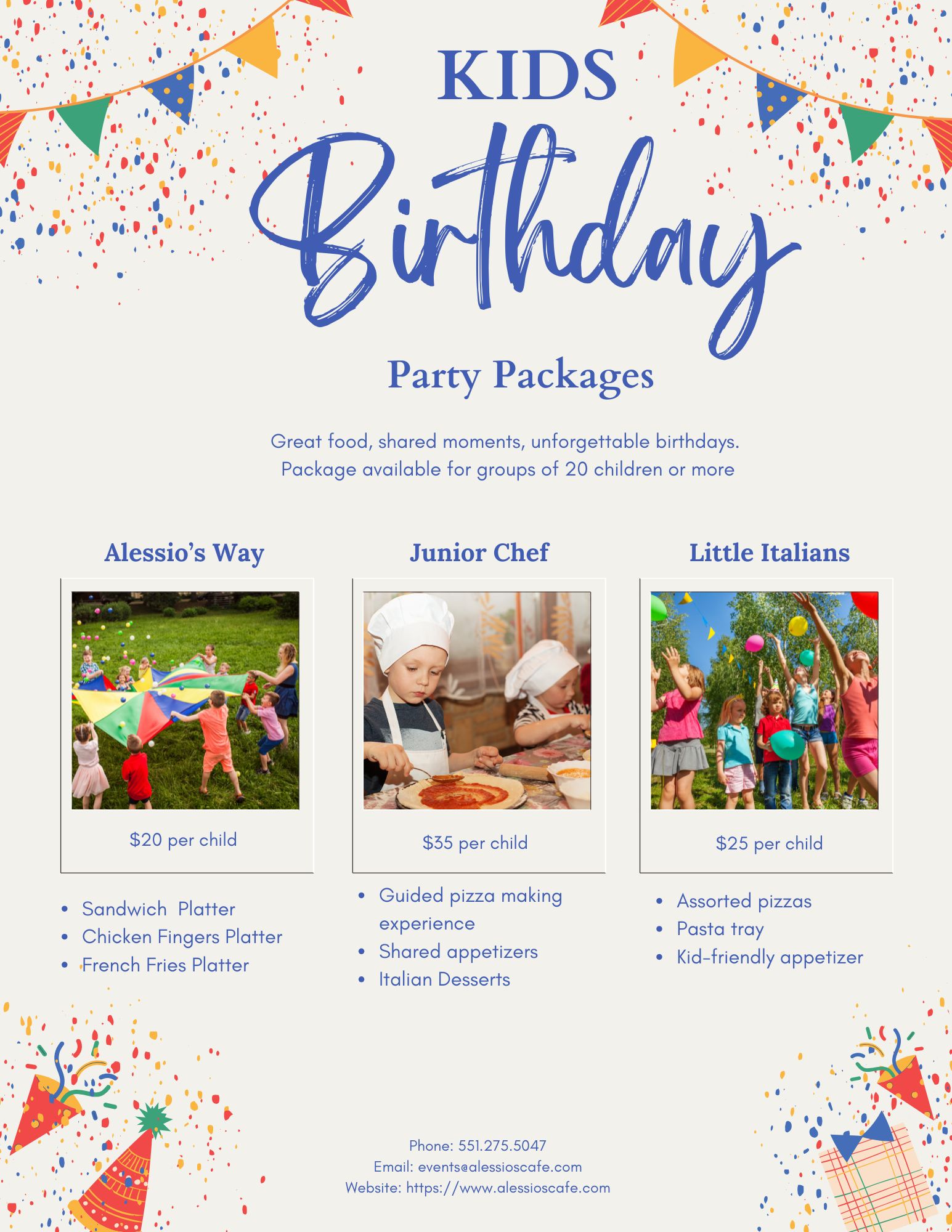 Visit https://www.alessioscafe.com/menu/catering-menu/ for pizza menu as well Chicken Fingers and other kids friendly options